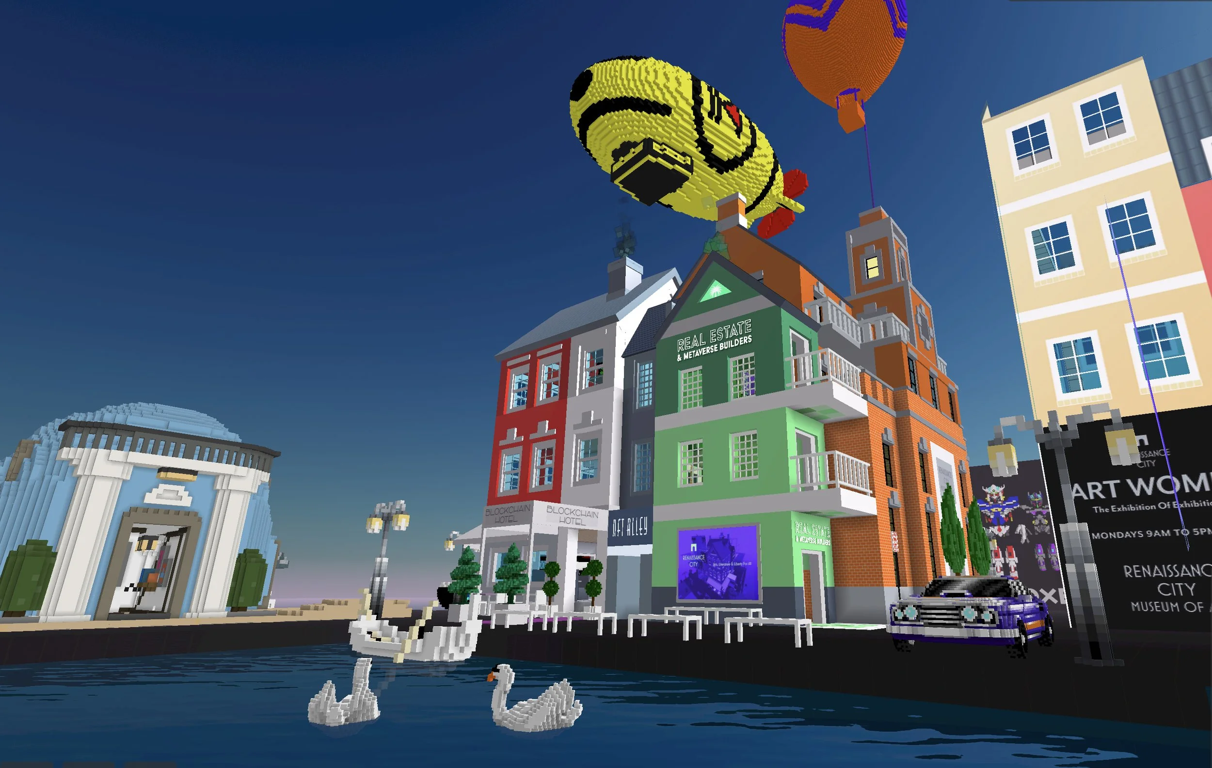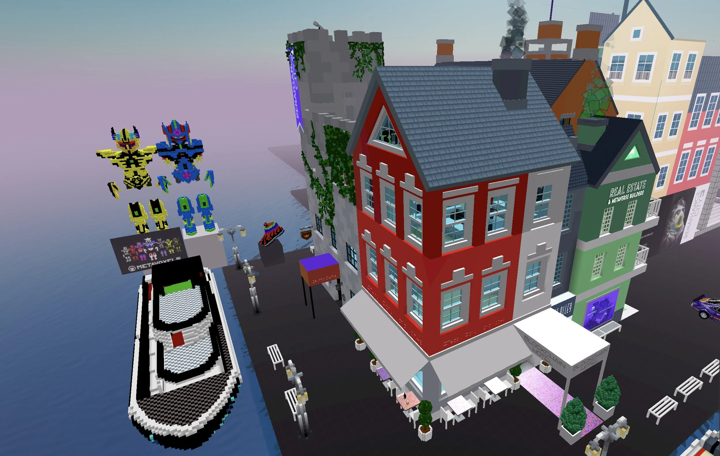 When designing Renaissance City in Voxels, we wanted to break with the squareness and futuristic feel of the Voxels metaverse. Based on a European city feel, and inspired by naive paintings, Renaissance City was born. Colorful, with orange bricks, yellow, red and green walls, and topped with gable roofs, this city block brought innocence, familiarity and nostalgia to a once sterile digital landscape.