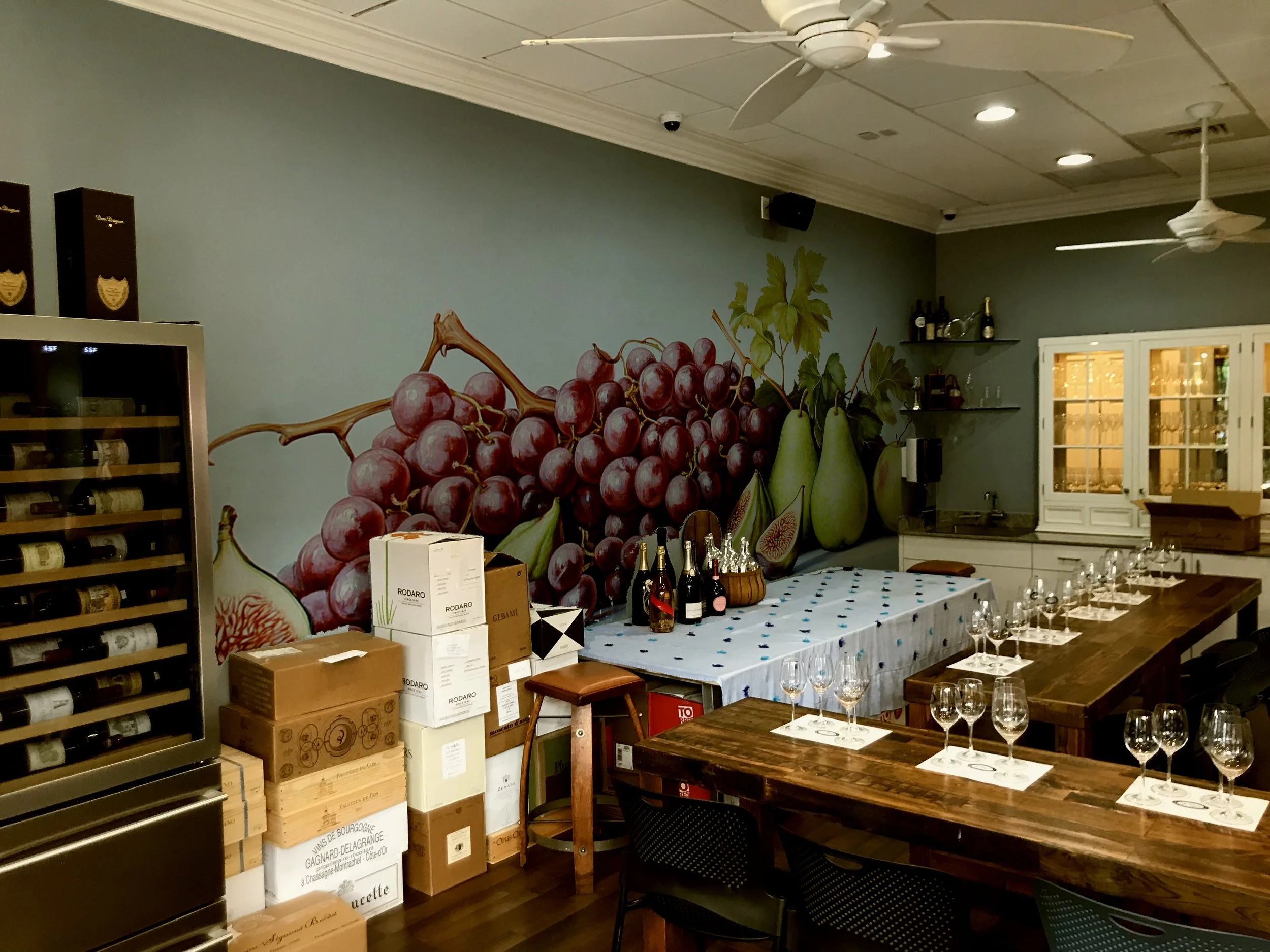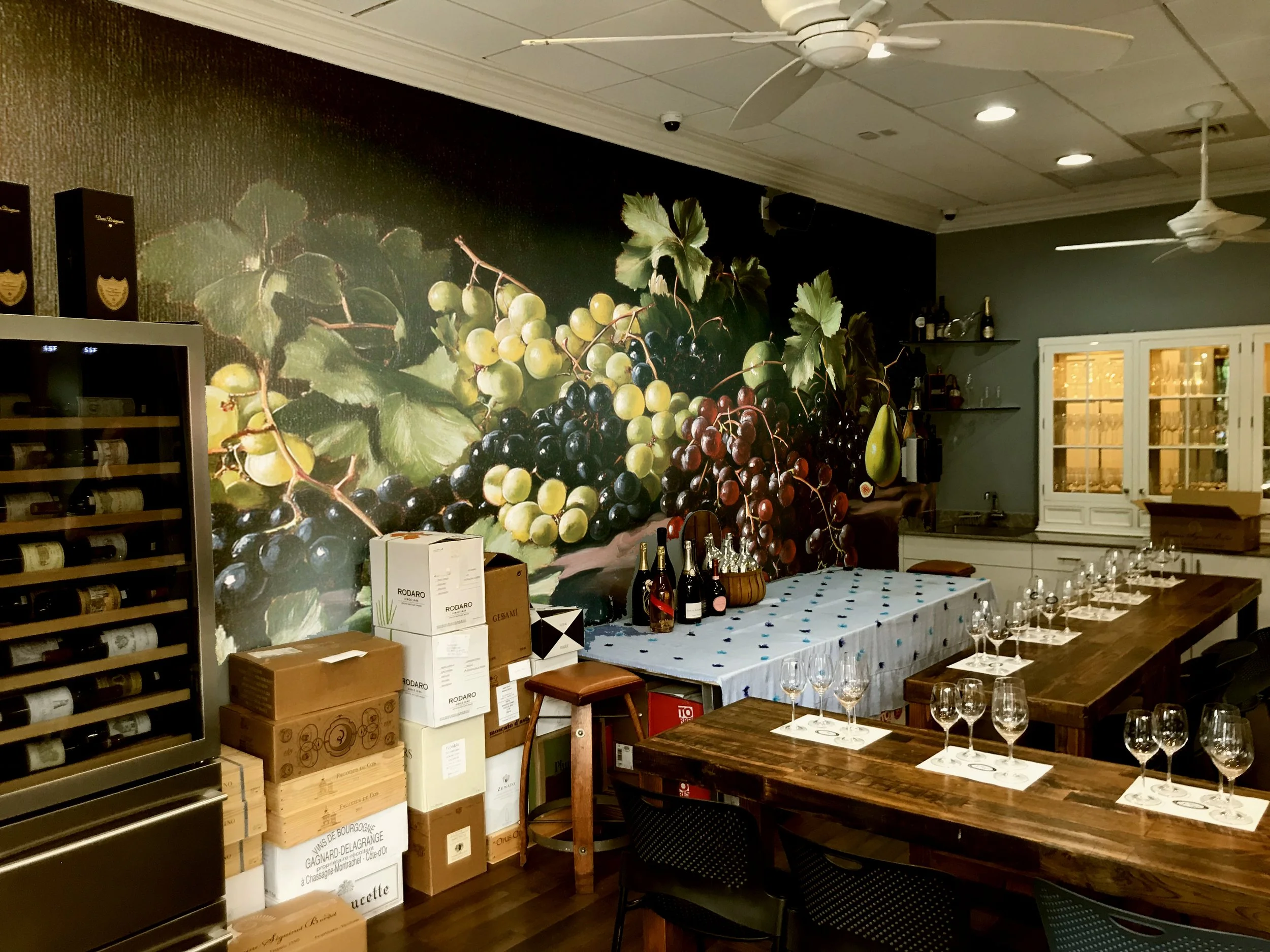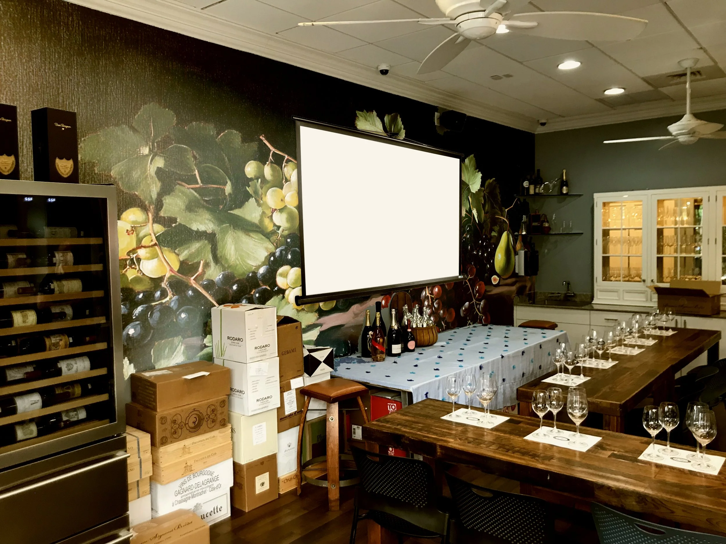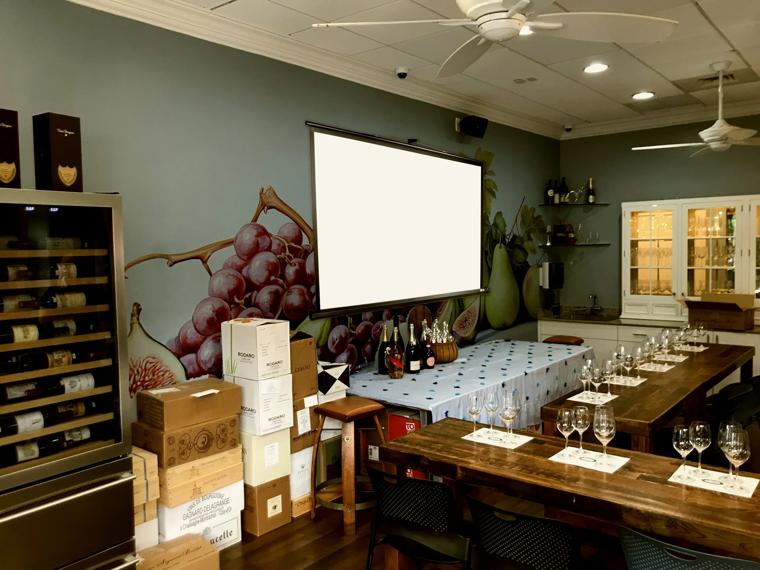 This wall was created to bring the wine and spirits feel to the main wall, which is the wall seen from all the windows. This area doesn’t need to feel like an academy, it is nicer to have the academy within a winery set-up. This wall should help walk-through traffic realize that this is a store, not just an academy, and this new look will also warm up the classes.