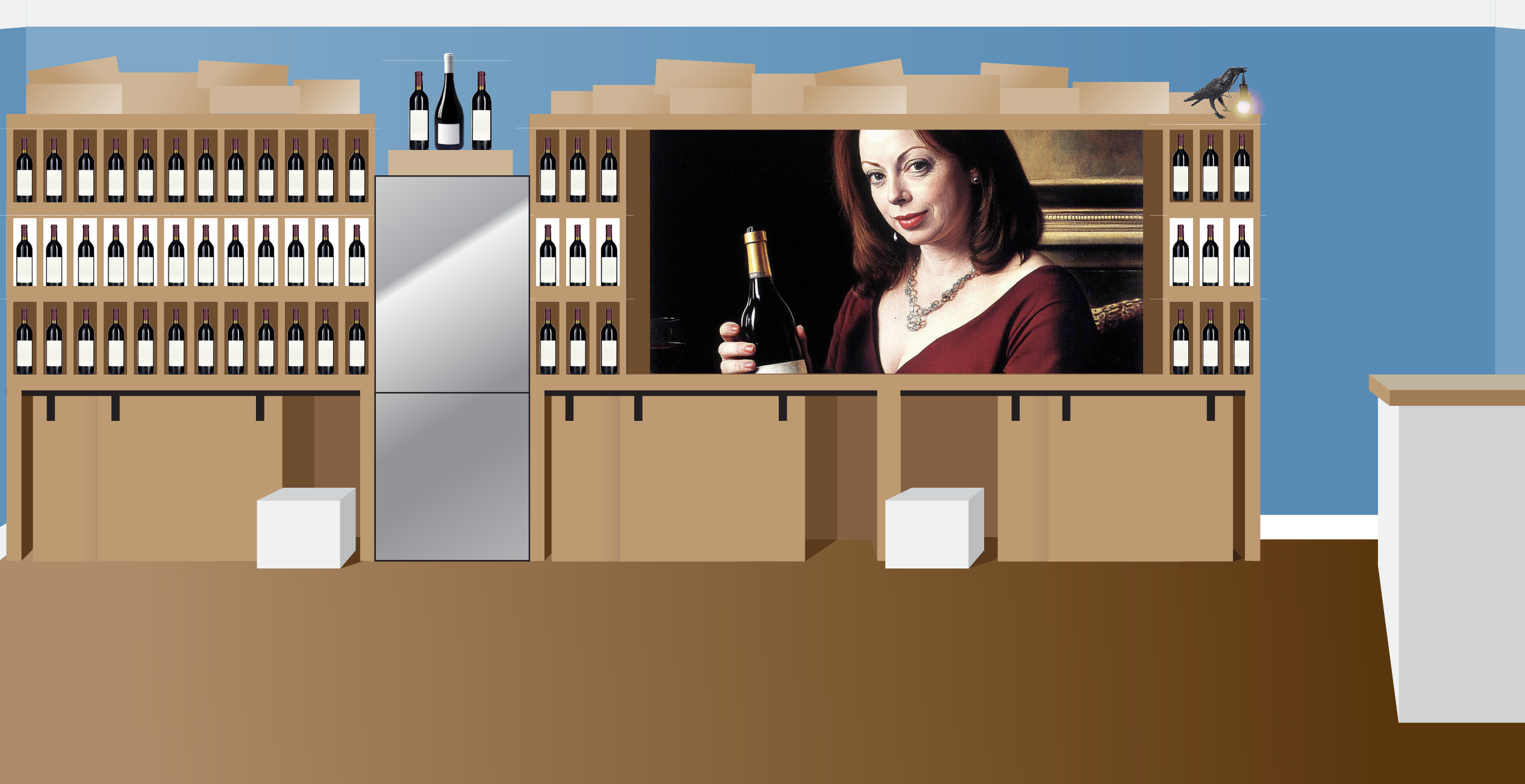 This may be a cheaper, and faster update to this room. It would communicate wine from afar, and creates a layer over which the stacked wine bottles look good. We recommend the second option, the half mural, it integrates better into the room, and should be cheaper and faster to produce. We recommend the mural expanding the entire wall, which allows for boxxes to be stacked all the way to the entrance, adding to the decor.