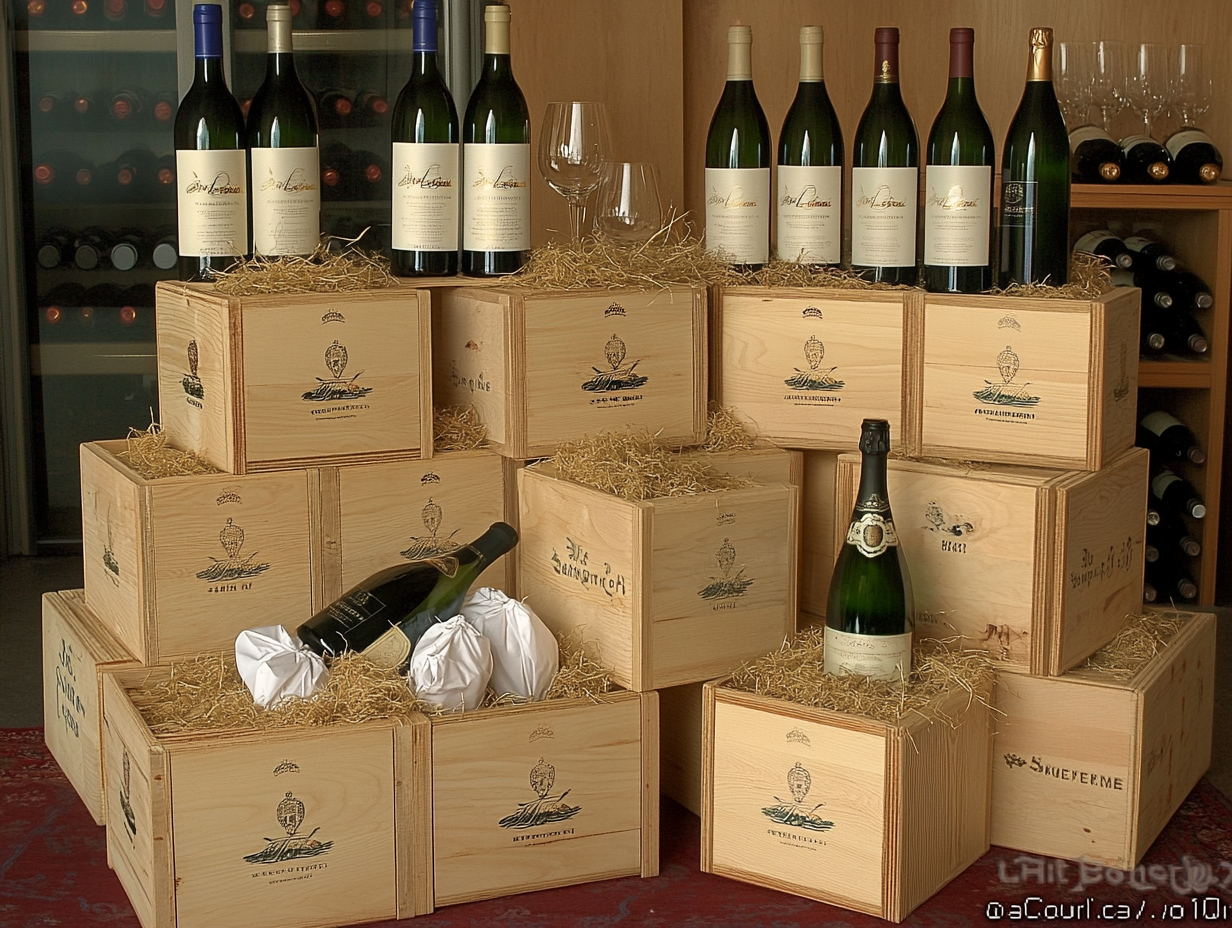 On the inside, you should be able to showcase real wine behind the stacked boxes. This would also integrate the boxes on top of the racks that you have throughout the store.